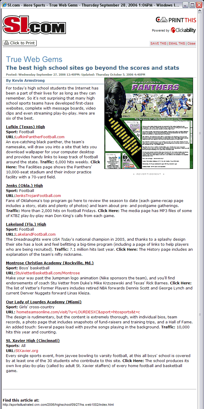 Our Lady of Lourdes Academy’s HomeTeamsONLINE site was picked by Sports Illustrated for their article "True Web Gems" (Sept 27, 2006). Their site is extremely thorough, featuring individual biographies, photos, slideshows, a Hall of Fame, training tips, and background music, and much more.