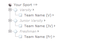 This is a very common situation. You will also be able to add more groupings and expand your setup once you get started. One tricky thing about this type of setup is that the team name is usually the same for all the different age groups. It is not a bad idea to indicate the type of team in the name as shown in above with an abbreviation such as (V) for Varsity, etc. This is not required - you can repeat the same team name if you want - but sometimes it is helpful to add that to the name to identify which team it is more easily.
