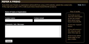 New! Referral Credit Program! Get Free Sports Websites by referring your friends and family to HomeTeamsONLINE.com. Referring friends to get future HomeTeamsONLINE credit couldn't be easier. Simply log-in to your website, click on the Refer a Friend link and submit your friend's name and email. For each site that signs up from your referral you will receive credit for free websites, upgrades and MB space.