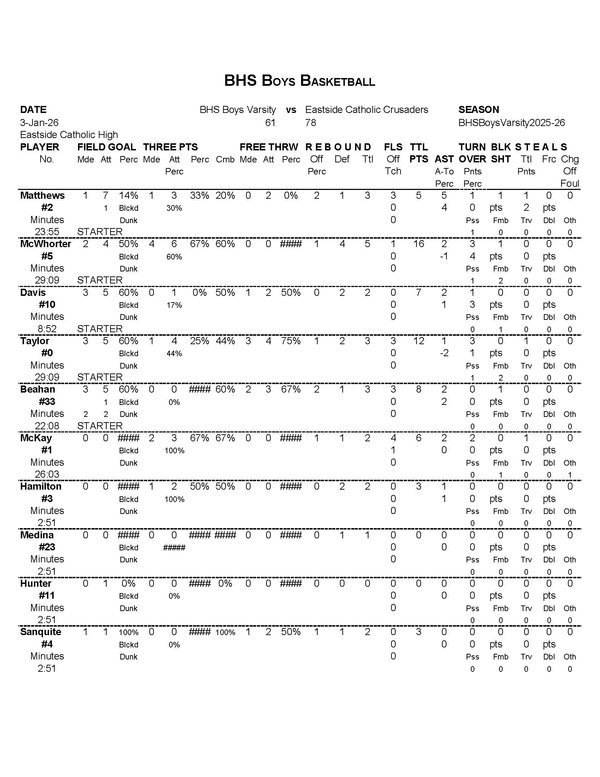 BHS Boys Varsity | 16 | 12 | 16 | 17 | 61 |