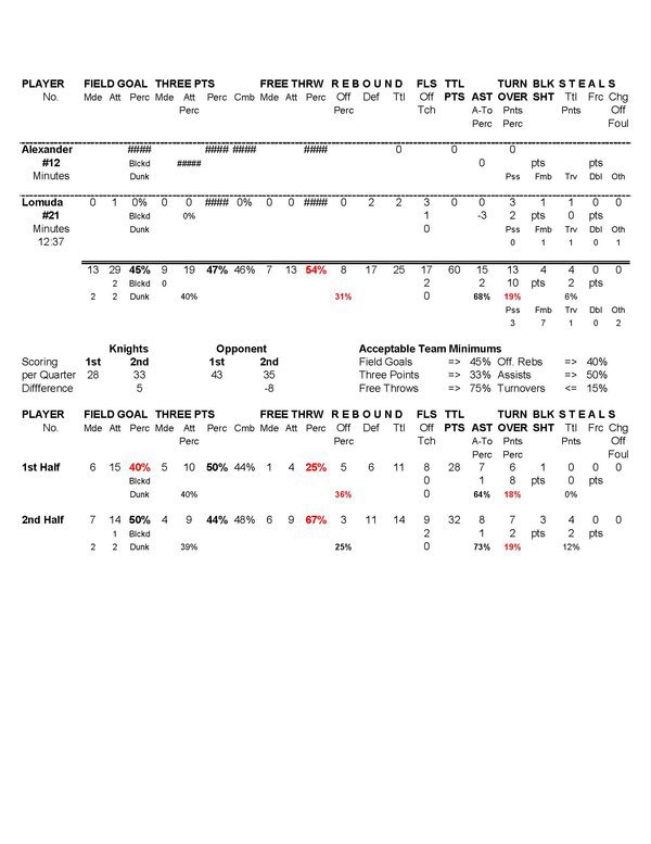 | Team Stats | 22 | 48 | 45.8 | 13 | 29 | 44.8 | 9 | 19 | 47.4 | 7 | 13 | 53.8 | 8 | 17 | 25 | 15 | 13 | 1.2 | 4 | 4 | 17 | 60 | |||