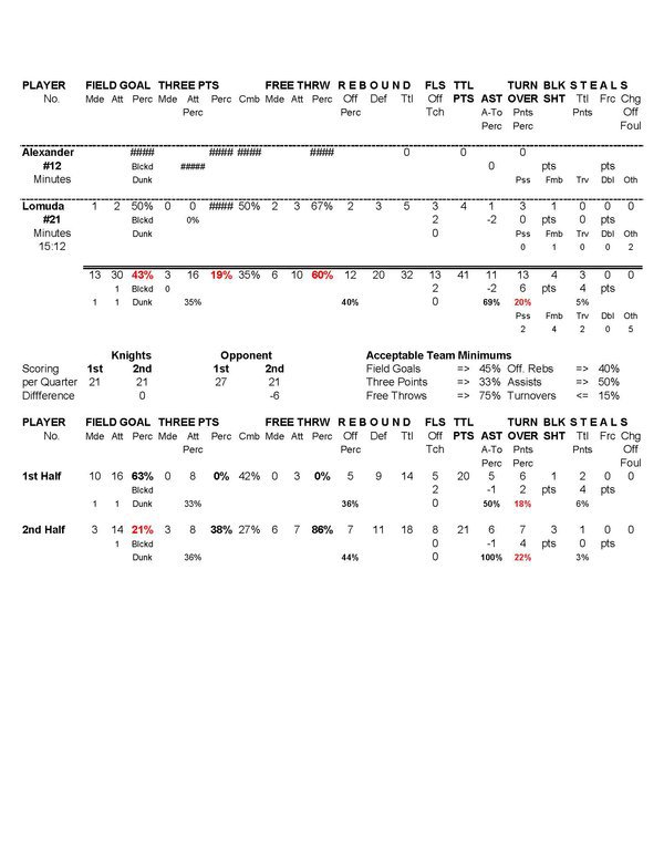 | 21 | Lomuda, Mark | 15 | 1 | 2 | 50.0 | 1 | 2 | 50.0 | .0 | 2 | 3 | 66.7 | 2 | 3 | 5 | 1 | 3 | .3 | 1 | 3 | 4 | ||||