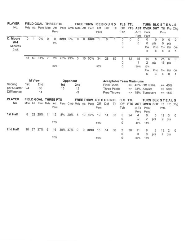 | 1 | Moore, D'Angelo | 1 | 28 | 1 | 22 | 4.5 | 10 | .0 | 1 | 12 | 8.3 | 4 | 8 | 50.0 | 1 | 3 | 4 | 2 | 4 | .5 | 5 | 1 | 7 | |||