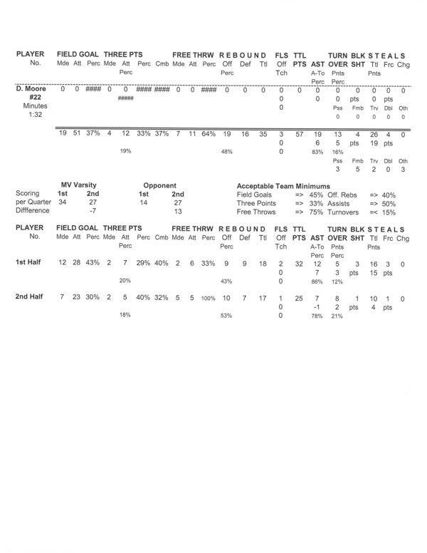 | Team Stats | 23 | 63 | 36.5 | 19 | 51 | 37.3 | 4 | 12 | 33.3 | 7 | 11 | 63.6 | 19 | 16 | 35 | 19 | 13 | 1.5 | 26 | 4 | 4 | 2 | 57 | |||