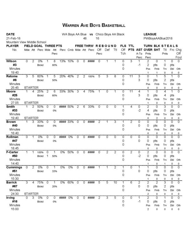 After Gurske, team-scoring and rebounding was evenly distributed between five Warren Ave players. Kayne Taylor logged 7 points (pts) and 2 rebounds (reb). Amondre Knight added 6 pts and 5 reb. Reserve center Tramon Bracy put together a season-high 5 pts and 5 reb. Starting forward Hunter Tipler, who sat the bench most of the 1st half with three fouls, contributed 4 pts and 4 reb. And, Danavien Colquitt followed with 3 pts and 4 reb, as well as the team’s only blocked shot.