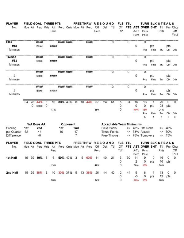 | No | Name | GS | M | A | % | M | A | % | M | A | % | M | A | % | O | D | Tot | AST | TO | A/T | STL | BLK | PF | PTS |