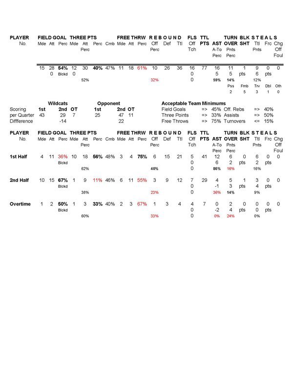 | Team Stats | 27 | 57 | 47.4 | 15 | 28 | 53.6 | 12 | 29 | 41.4 | 11 | 18 | 61.1 | 10 | 26 | 36 | 16 | 13 | 1.2 | 9 | 1 | 16 | 77 | ||