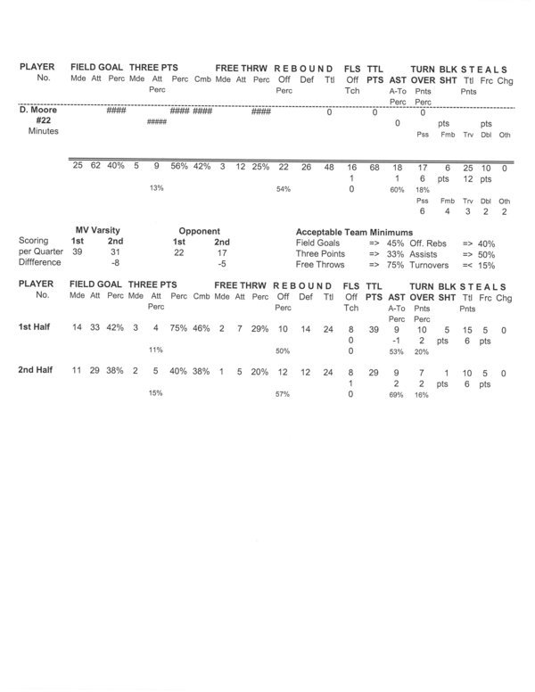 | Team Stats | 28 | 70 | 40.0 | 23 | 62 | 37.1 | 5 | 8 | 62.5 | 3 | 10 | 30.0 | 23 | 27 | 50 | 14 | 18 | .8 | 21 | 6 | 10 | 14 | 64 | ||