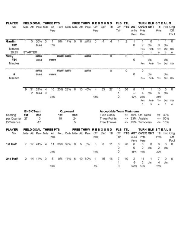 | Team Stats | 13 | 47 | 27.7 | 9 | 31 | 29.0 | 4 | 16 | 25.0 | 6 | 15 | 40.0 | 4 | 23 | 27 | 8 | 17 | .5 | 15 | 1 | 3 | 15 | 36 | ||