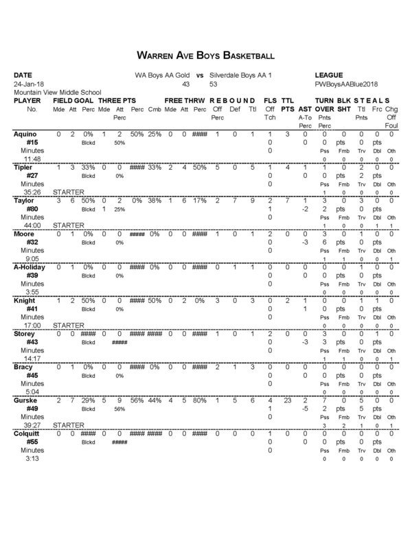 | Team Stats | 21 | 59 | 35.6 | 16 | 40 | 40.0 | 5 | 19 | 26.3 | 6 | 15 | 40.0 | 12 | 22 | 34 | 7 | 12 | .6 | 16 | 4 | 3 | 11 | 53 | ||