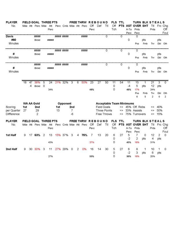 | No | Name | GS | M | A | % | M | A | % | M | A | % | M | A | % | O | D | Tot | AST | TO | A/T | STL | BLK | DFL | PF | PTS |