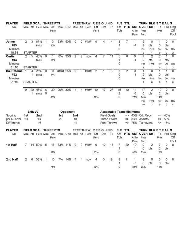 | Team Stats | 15 | 50 | 30.0 | 9 | 20 | 45.0 | 6 | 30 | 20.0 | 4 | 4 | 100.0 | 10 | 17 | 27 | 11 | 17 | .6 | 10 | 2 | 2 | 15 | 40 | ||