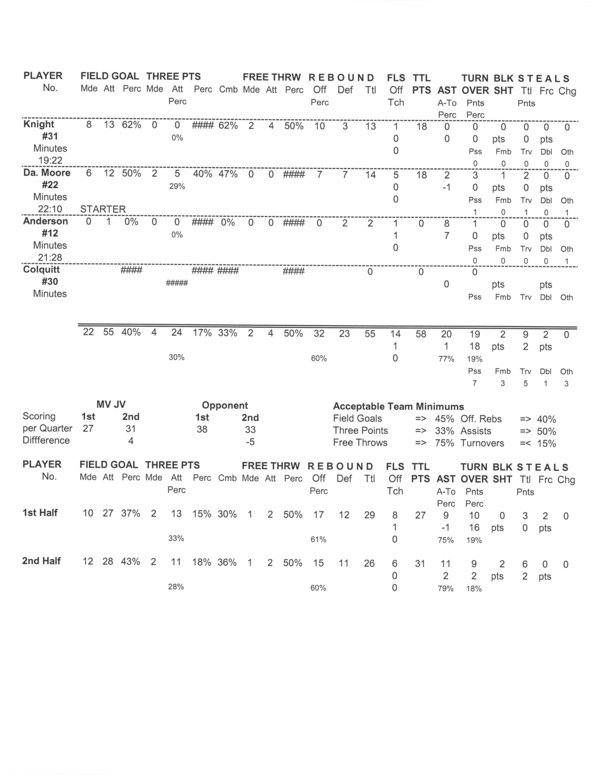 | Team Stats | 26 | 79 | 32.9 | 22 | 55 | 40.0 | 4 | 24 | 16.7 | 2 | 4 | 50.0 | 32 | 23 | 55 | 20 | 19 | 1.1 | 9 | 2 | 1 | 14 | 58 | ||