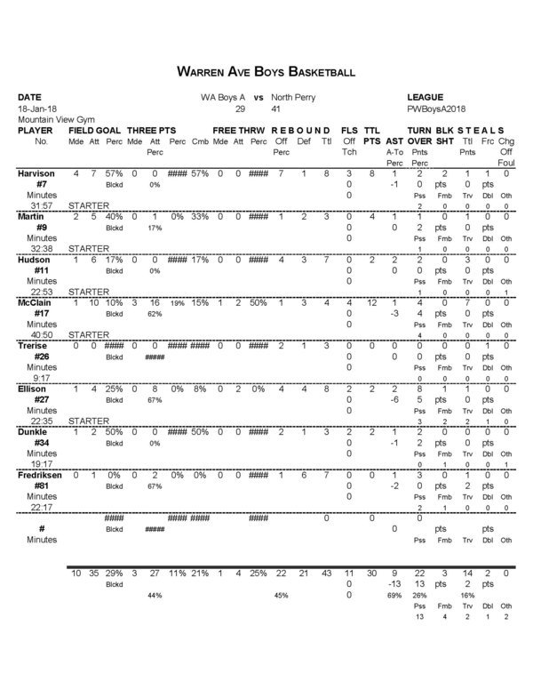 | Team Stats | 13 | 62 | 21.0 | 10 | 35 | 28.6 | 3 | 27 | 11.1 | 1 | 4 | 25.0 | 22 | 21 | 43 | 9 | 22 | .4 | 14 | 3 | 2 | 11 | 30 | ||
