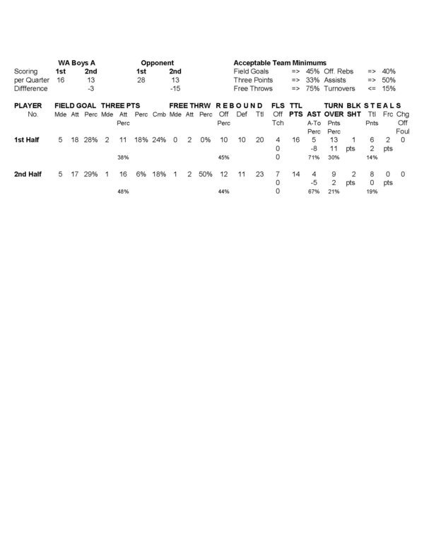 | No | Name | GS | M | A | % | M | A | % | M | A | % | M | A | % | O | D | Tot | AST | TO | A/T | STL | BLK | DFL | PF | PTS |