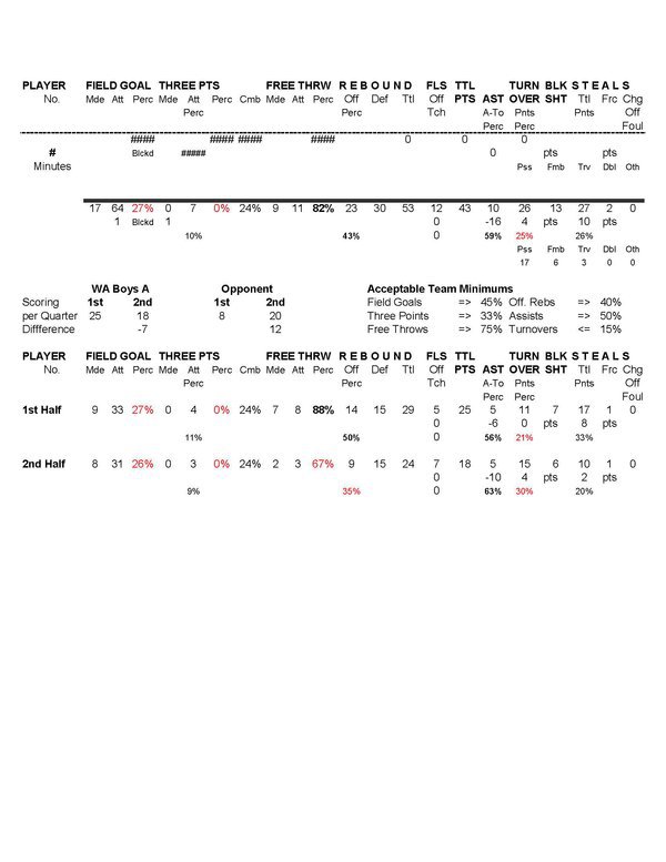 | Team Stats | 15 | 28 | 53.6 | 9 | 16 | 56.2 | 6 | 12 | 50.0 | 4 | 8 | 50.0 | 4 | 3 | 7 | 6 | 6.0 | 7 | 1 | 1 | 40 | ||