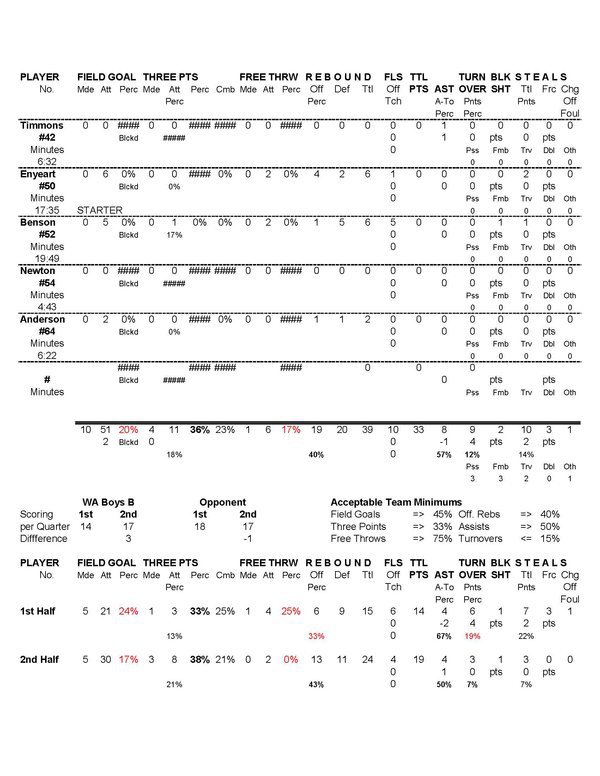 | Team Stats | 14 | 62 | 22.6 | 10 | 51 | 19.6 | 4 | 11 | 36.4 | 1 | 6 | 16.7 | 19 | 20 | 39 | 8 | 9 | .9 | 10 | 2 | 1 | 3 | 10 | 33 | ||