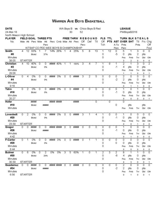 | No | Name | GS | M | A | % | M | A | % | M | A | % | M | A | % | O | D | Tot | AST | TO | A/T | STL | BLK | CHG | PF | PTS |