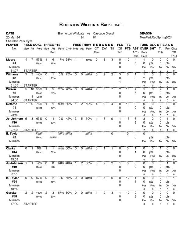 | 10 | Johnson, JoJo (Joshua)) | 1 | 5 | 12 | 41.7 | 5 | 8 | 62.5 | 4 | .0 | 3 | 5 | 60.0 | 1 | 8 | 9 | 6 | 3 | 2.0 | 2 | 2 | 1 | 1 | 13 | |||