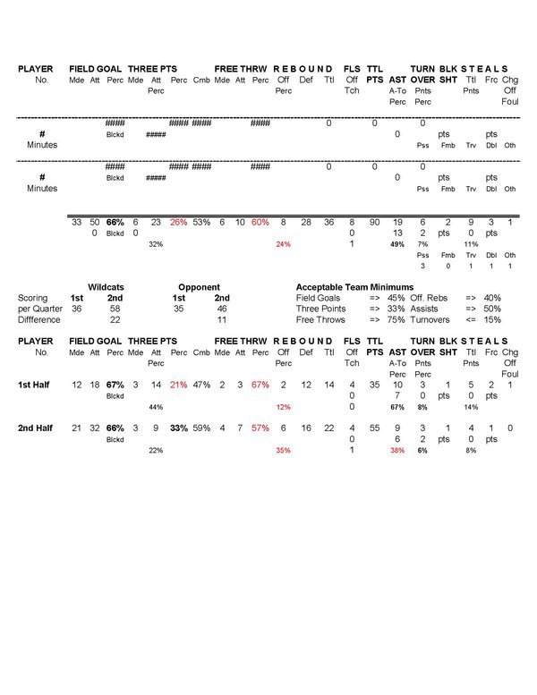 | Team Stats | 39 | 73 | 53.4 | 33 | 50 | 66.0 | 6 | 23 | 26.1 | 6 | 10 | 60.0 | 8 | 28 | 36 | 22 | 6 | 3.7 | 9 | 2 | 1 | 3 | 8 | 1 | 90 | ||