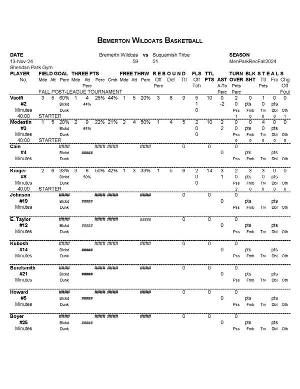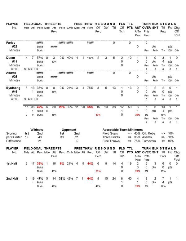 | 45 | Byrdsong, Brandon | 1 | 5 | 21 | 23.8 | 5 | 13 | 38.5 | 8 | .0 | 3 | 4 | 75.0 | 8 | 5 | 13 | .0 | 2 | 2 | 1 | 1 | 13 | ||||